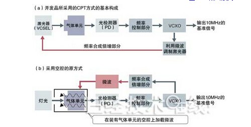原來(lái)的方式采用燈光作為光源,在容納氣體單元的“空腔”容器上加載微波。當(dāng)空腔變小時(shí),長(zhǎng)期頻率穩(wěn)定度就會(huì)降低,因此小型化存在限制。