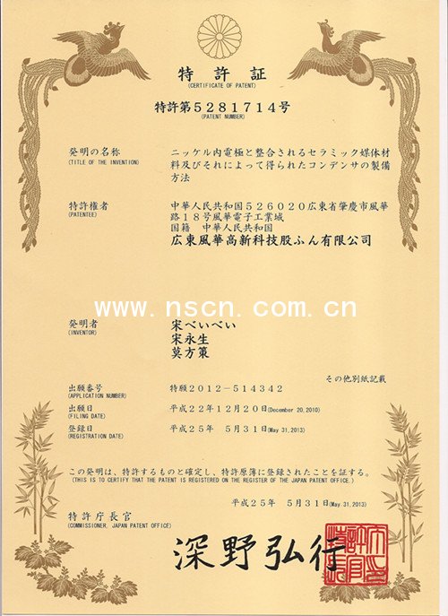 近期,風華高科下屬分公司電子工程開發(fā)分公司的《ニッケル內(nèi)電極と整合されるセラミック媒體材料及びそれによって得られたコンデンサの製備方法》獲得日本特許廳授權的日本專利(中文譯名:一種與鎳內(nèi)電極匹配的陶瓷介質材料及所得電容器的制備方法;發(fā)明人名單:宋蓓蓓、宋永生、莫方策、任海東、王孝國、郭精華等)。