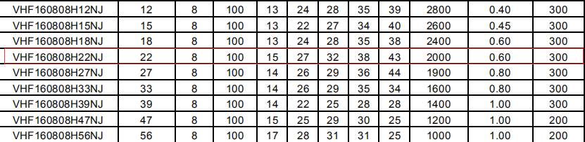 對比后發(fā)現(xiàn),在測試頻率100MHz的情況下,兩者飽和電流均為300mA,VHF160808H22NJT的自諧振頻率Min2000MHz,直流電阻Max0.6Ω,VHF201209H22NJT的自諧振頻率Min1700MHz,直流電阻Max0.5Ω,所以說如果自諧振頻率在2000以上兩者都可以,在1700—2000MHz時,只能用VHF201209H22NJT。