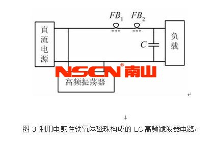 由于鐵氧體磁珠在電路中使用能夠增加高頻損耗而又不引入直流損耗,而且體積小、便于安裝在區(qū)間的引線或者導(dǎo)線上,對于1MHz以上的噪 聲信號(hào)抑制效果十分明顯,因此可用作高頻電路的去耦、濾波以及寄生振蕩的抑制等。特別對消除電路內(nèi)部由開關(guān)器件引起的電流突變和濾波電源線或其它導(dǎo)線引入 電路的高頻噪聲干擾效果明顯。低阻抗的供電回路、諧振電路、丙類功率放大器以及可控硅開關(guān)電路等,使用鐵氧體磁珠進(jìn)行濾波都是十分有效的。鐵氧體磁珠一般 可以分為電阻性和電感性兩類,使用時(shí)可以根據(jù)需要選取。單個(gè)磁珠的阻抗一般為十至幾百歐姆,應(yīng)用時(shí)如果一個(gè)衰減量不夠時(shí)可以用多個(gè)磁珠串聯(lián)使用,但是通常 三個(gè)以上時(shí)效果就不會(huì)再明顯增加了[7]。如圖3示出了利用兩只電感性鐵氧體磁珠構(gòu)成的高頻LC濾波器電路,該電路可有效的吸收由高頻振蕩器產(chǎn)生的振蕩信 號(hào)而不致竄入負(fù)載,并且不降低負(fù)載上的直流電壓。