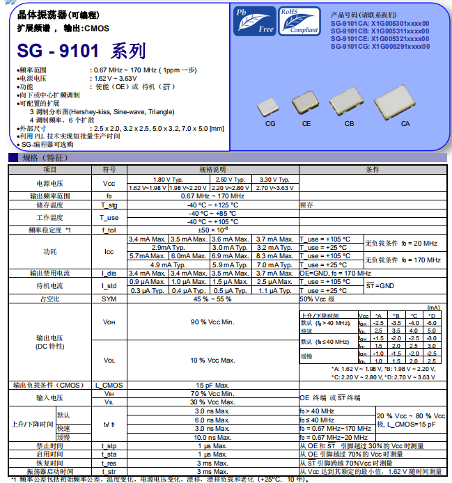 大家好,今天給大家介紹擴(kuò)展頻率晶振中的SG-9101CE。SG-9101CE是一款小尺寸3225有源晶振。隨著市場(chǎng)小型化、多功能、高信賴(lài)度的電子產(chǎn)品需求量大增,產(chǎn)品開(kāi)發(fā)周期時(shí)間要求越來(lái)越短,傳統(tǒng)的石英晶振性能優(yōu)異,但設(shè)計(jì)制造周期相對(duì)較長(zhǎng),如果有工程師因?yàn)轫?xiàng)目急需特殊頻點(diǎn),特殊封裝的晶振產(chǎn)品用于設(shè)計(jì)測(cè)試,很有可能無(wú)法短期內(nèi)獲得對(duì)應(yīng)頻點(diǎn)的樣品而可能耽誤設(shè)計(jì)周期,影響項(xiàng)目交付進(jìn)度。擴(kuò)展頻率晶振的出現(xiàn)極大的解決了工程師對(duì)新產(chǎn)品晶振的實(shí)時(shí)變更需求。SG-9101CE內(nèi)置一個(gè)高穩(wěn)定的有源晶振(基頻),利用PLL技術(shù),配合對(duì)應(yīng)的工具軟件及外置的編程器方便的調(diào)整分頻/倍頻參數(shù),并在線燒錄,幾分鐘就定制成一個(gè)客戶(hù)所需的全新晶振。這樣就大大節(jié)省了客戶(hù)的等待時(shí)間,實(shí)時(shí)提供樣片供用戶(hù)測(cè)試。另外對(duì)于用量相對(duì)較小的用戶(hù),可以采取這種方式批量生產(chǎn),極速交付。SG-9101系列可以分為: SG-9101CA 7050  SG-9101CB 5032 SG-9101CE 3225 SG-9101CG 2520 ,而其中SG-9101CE是小尺寸3225有源晶振同時(shí)也是銷(xiāo)量很高的一款擴(kuò)展頻率晶振。SG-9101CE頻率可編程范圍0.67MHz~170MHz(每步1ppm),擴(kuò)展頻率范圍±0.25%~±4%。SG-9101CE新品提供更寬廣的操作溫度范圍,及降低50%的消耗電流。SG-9101CE擴(kuò)展頻率晶振的消耗電流比現(xiàn)行量產(chǎn)品更大幅降低了75%。SG-9101CE的擴(kuò)展頻率晶振提供幾種類(lèi)型的調(diào)制方式,可以實(shí)現(xiàn)б值為±0.5%、±0.75%、±1%、±1.5%、±2%和0.25%的調(diào)制,實(shí)踐證明引入擴(kuò)展頻率晶振調(diào)制引入的時(shí)鐘信號(hào)抖動(dòng)很小。SG-9101CE通過(guò)動(dòng)態(tài)改變時(shí)鐘頻率,有效降低d電磁輻射功率,減少EMI電磁干擾的影響,南山電子依然給大家提供SG-9101CE規(guī)格書(shū)以供大家選型參考: